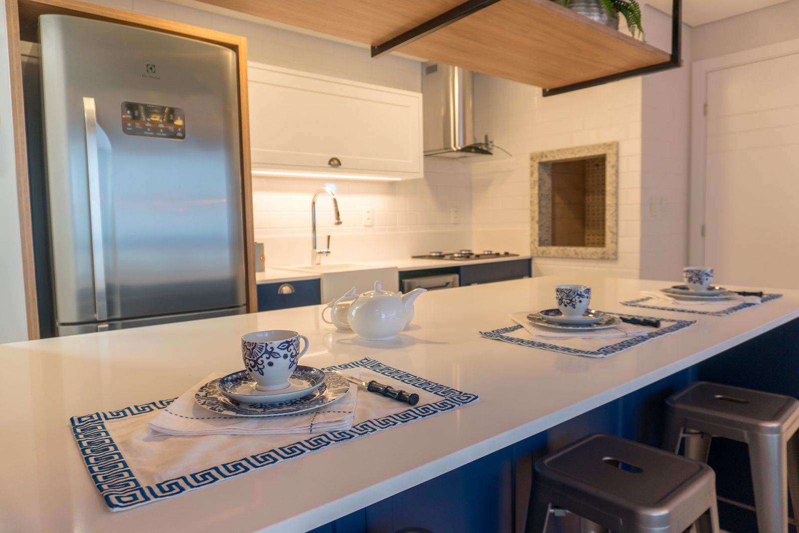 As cores neutras e mais escuras são as principais escolhas para o ambiente, com o destaque ficando por conta do contraste entre os móveis planejados nas cores azul colonial, branco e o cimento queimado, um acabamento perfeito para quem busca um diferencial estético.