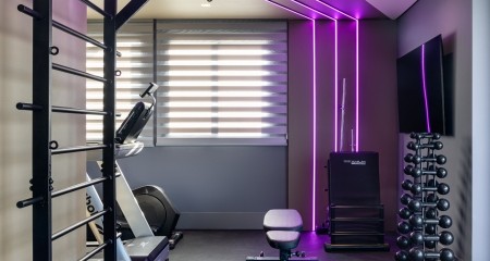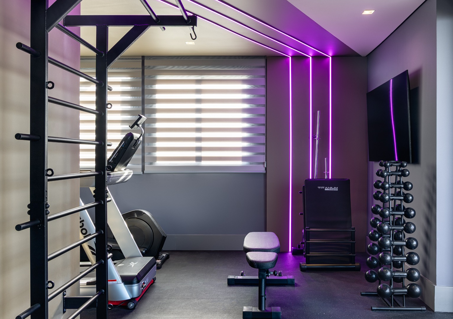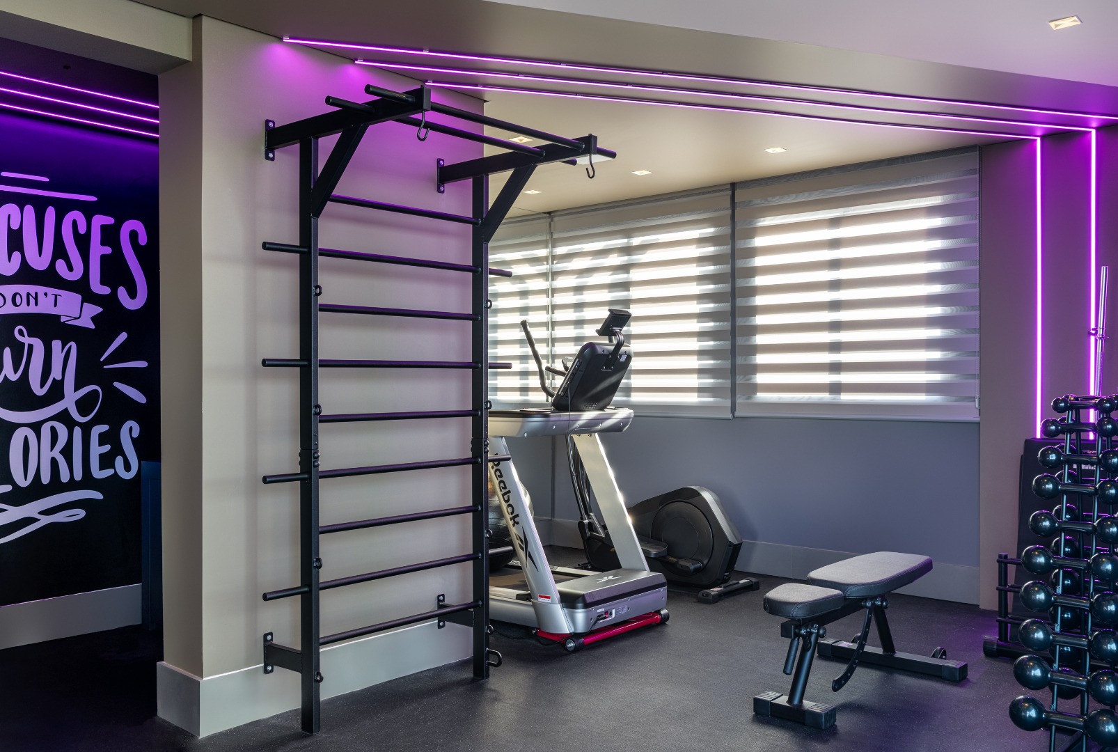 - Academia com Terraço Zen equipada com dois espaços diferenciados: uma área de pesos livres e equipamentos aeróbicos, com piso vinílico; outra área destinada para alongamento e relaxamento com vista para o mar;