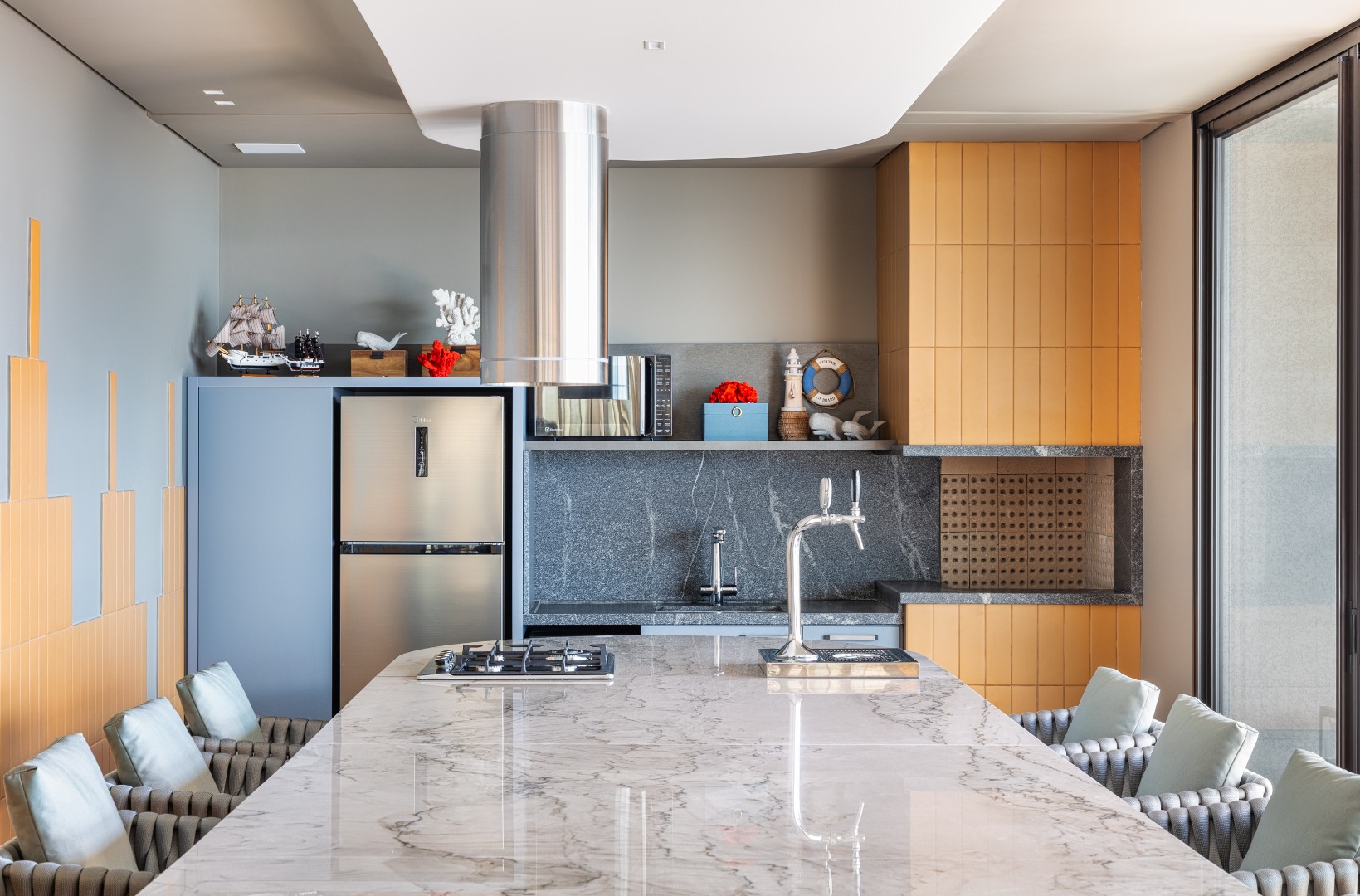 - Salão Gourmet e Terraço Celebrate com vista para o mar, mobiliado e equipado, possuindo churrasqueira a carvão e bancada gourmet com máquina de gelo;
