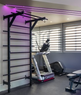 - Academia com Terraço Zen equipada com dois espaços diferenciados: uma área de pesos livres e equipamentos aeróbicos, com piso vinílico; outra área destinada para alongamento e relaxamento com vista para o mar;